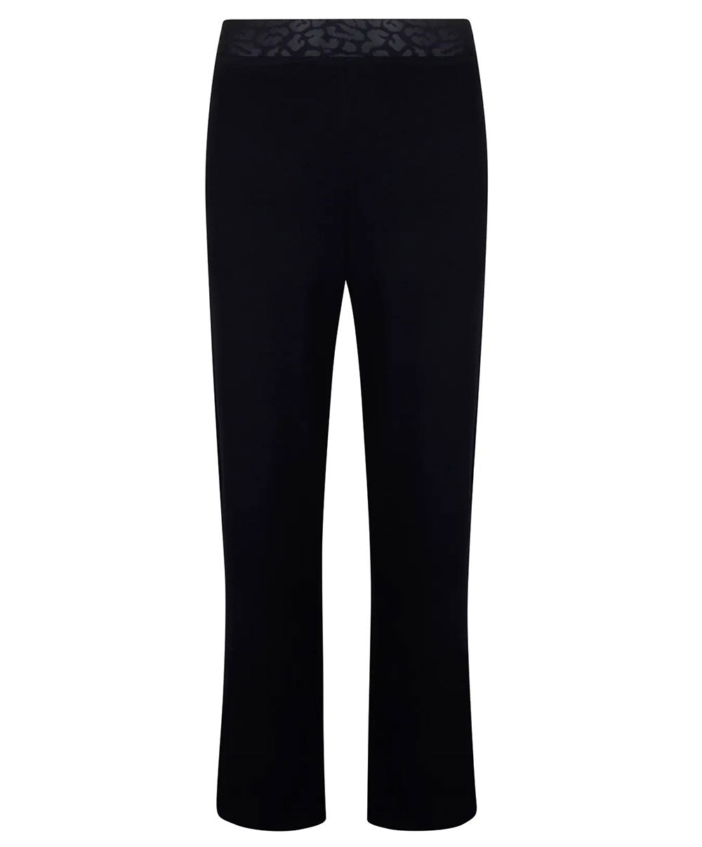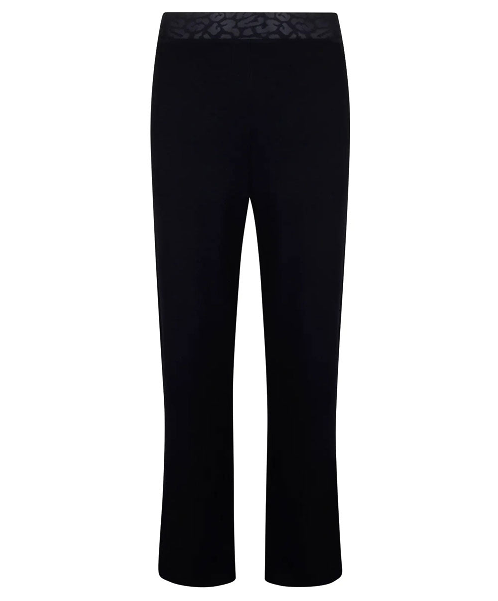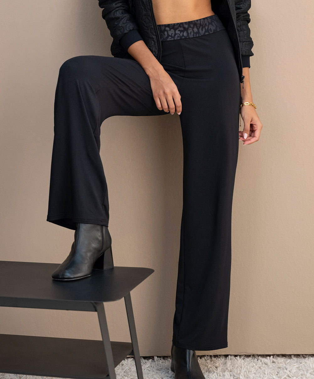 -Ce pantalon offre une coupe plutôt ample et des chevilles larges façon pattes d'eph pour un porter fluide et un confort optimal. Il possède en finitions un élastique dissimulé à la taille pour une taille cintrée et une silhouette ultra-féminine, ainsi qu'une large bordure de maille panthère signature de la ligne, en guise de ceinture.