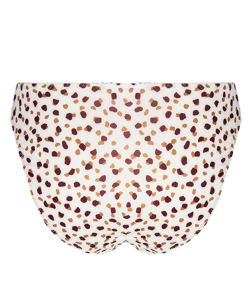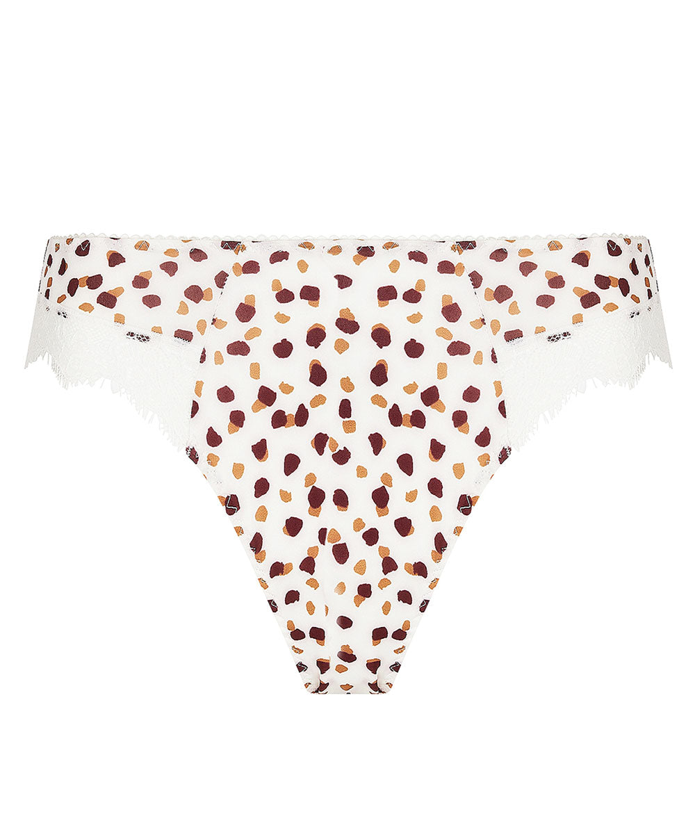 -Sous-vêtement chic conçu à partir d'une maille douce ivoire imprimée de pépites gourmandes brunes et cafés pour un porter et un ajustement incomparables, associée à une dentelle florale et graphique blanche pour un style élégant et féminin.