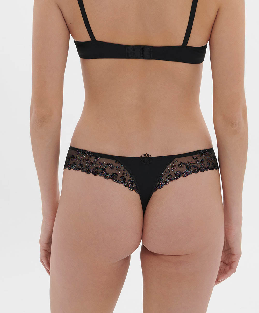 -This thong offers relatively little fabric and a very open cut at the back for a glamorous and sexy look and revealed buttocks in a rather cheeky way! Play the seduction card with its transparent embroidered tulle which will boldly reveal the grain of your skin for increased sex appeal.