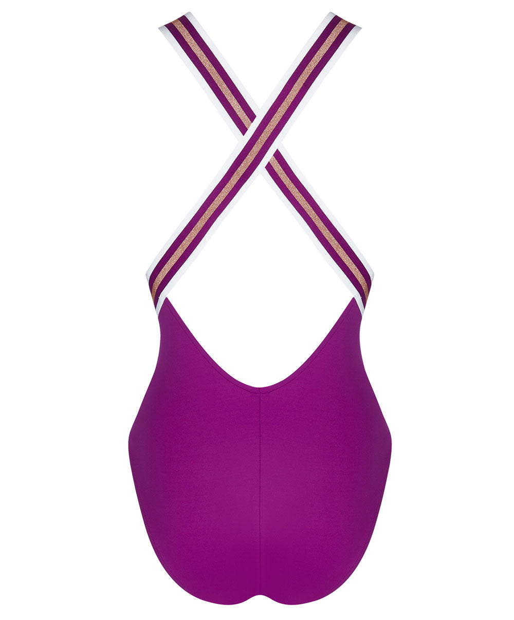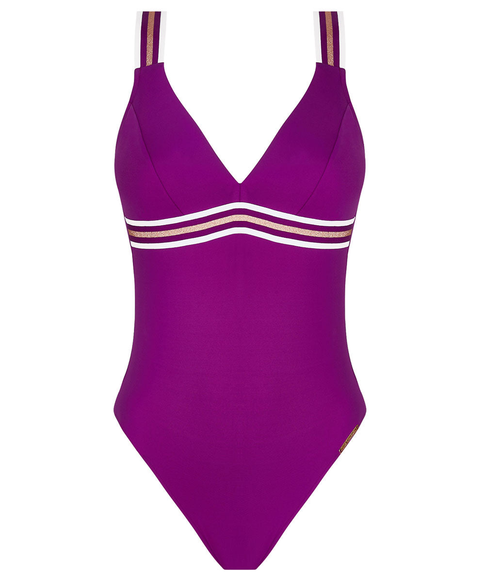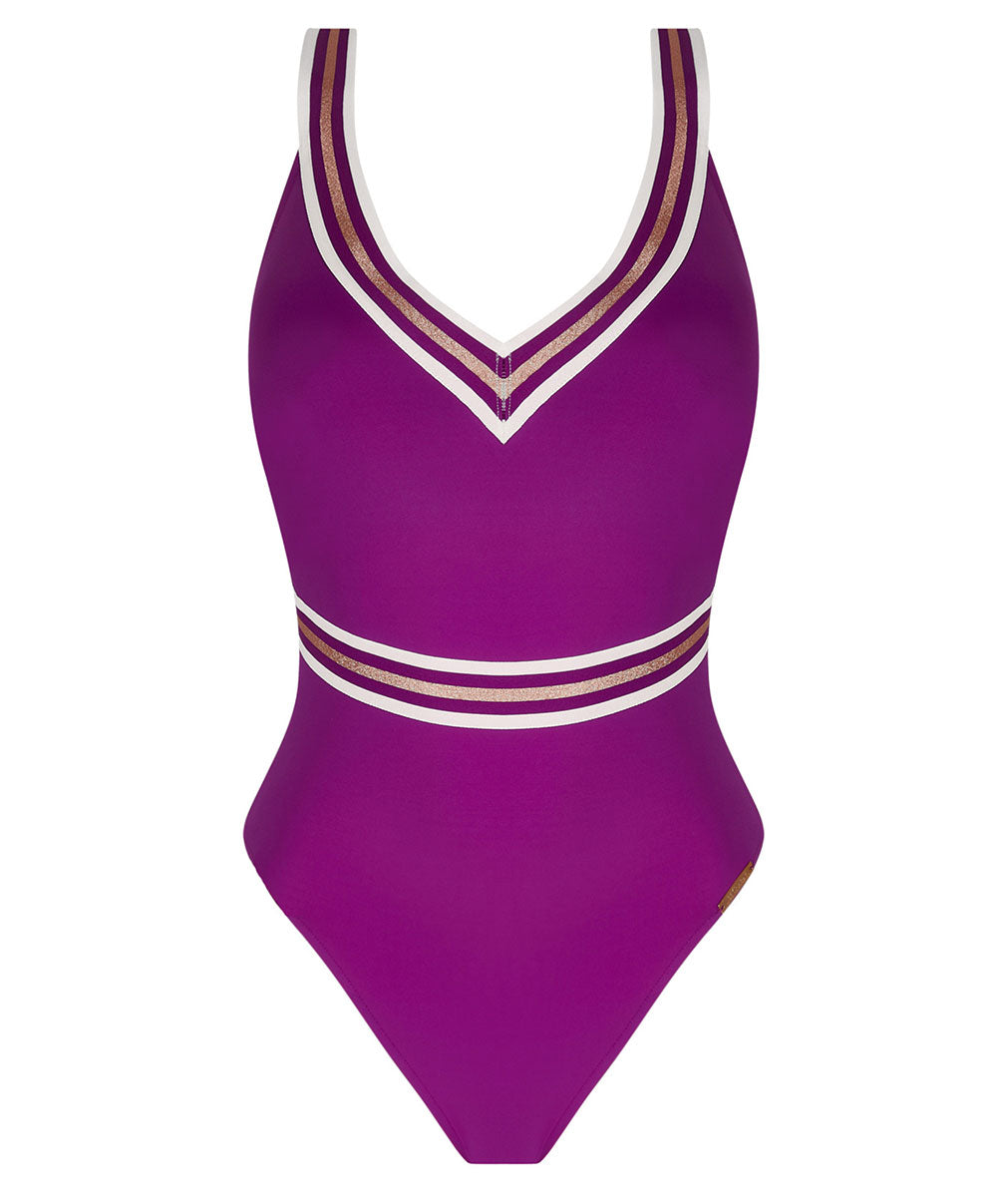 The Énergie Nautique swimwear collection from Lise Charmel: this line of swimwear offers swimsuits with a pure design simplicity in a haute couture spirit. These swimsuits are made from a very durable blackcurrant Lycra Sport® mesh that will hug your curves and last over time. The white and gold striped elasticated trims give them a sporty chic look and contrast with the solid color of the mesh for added originality.