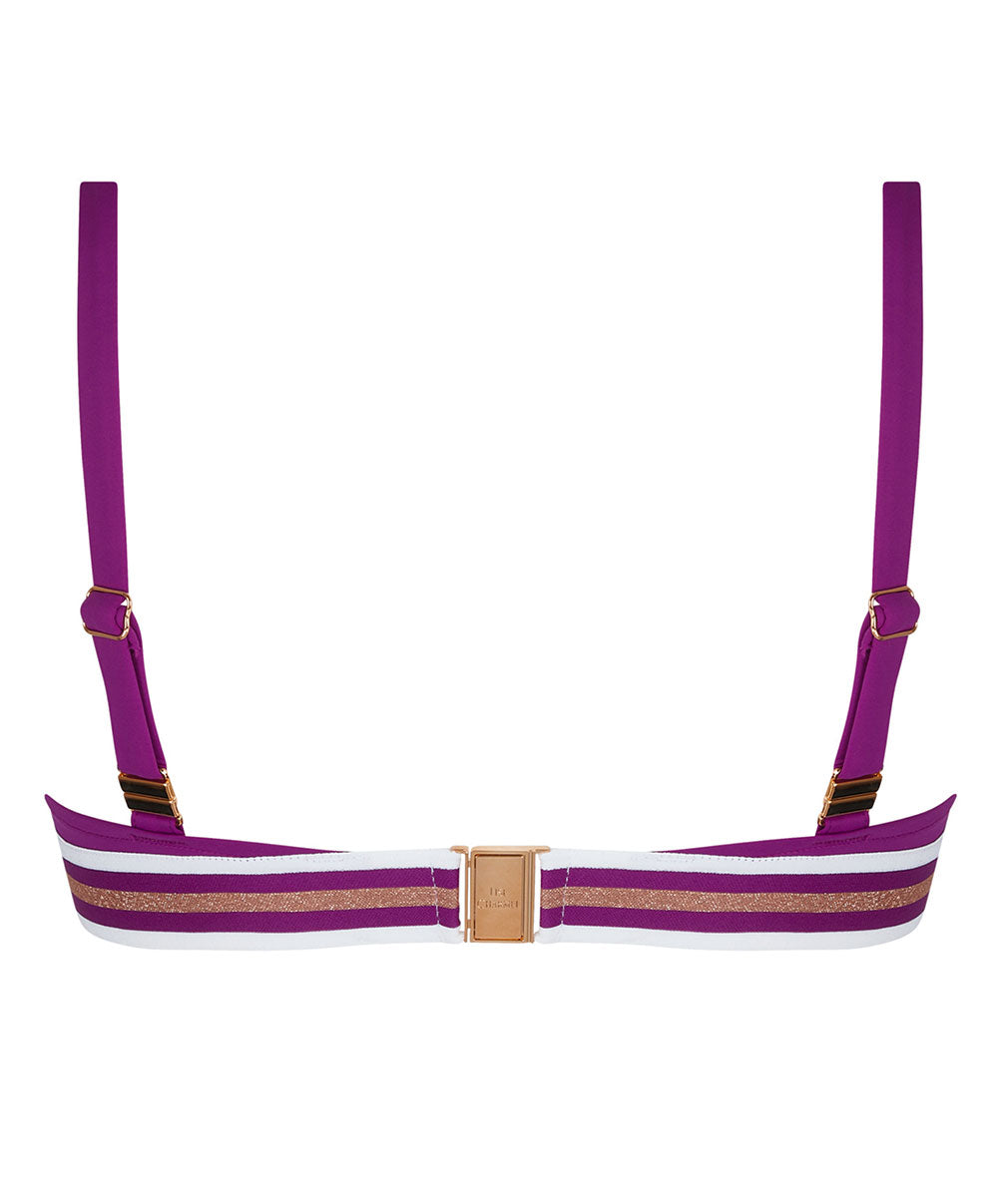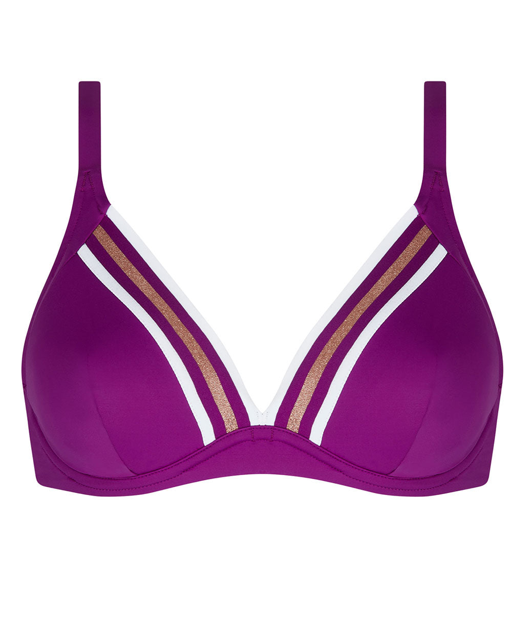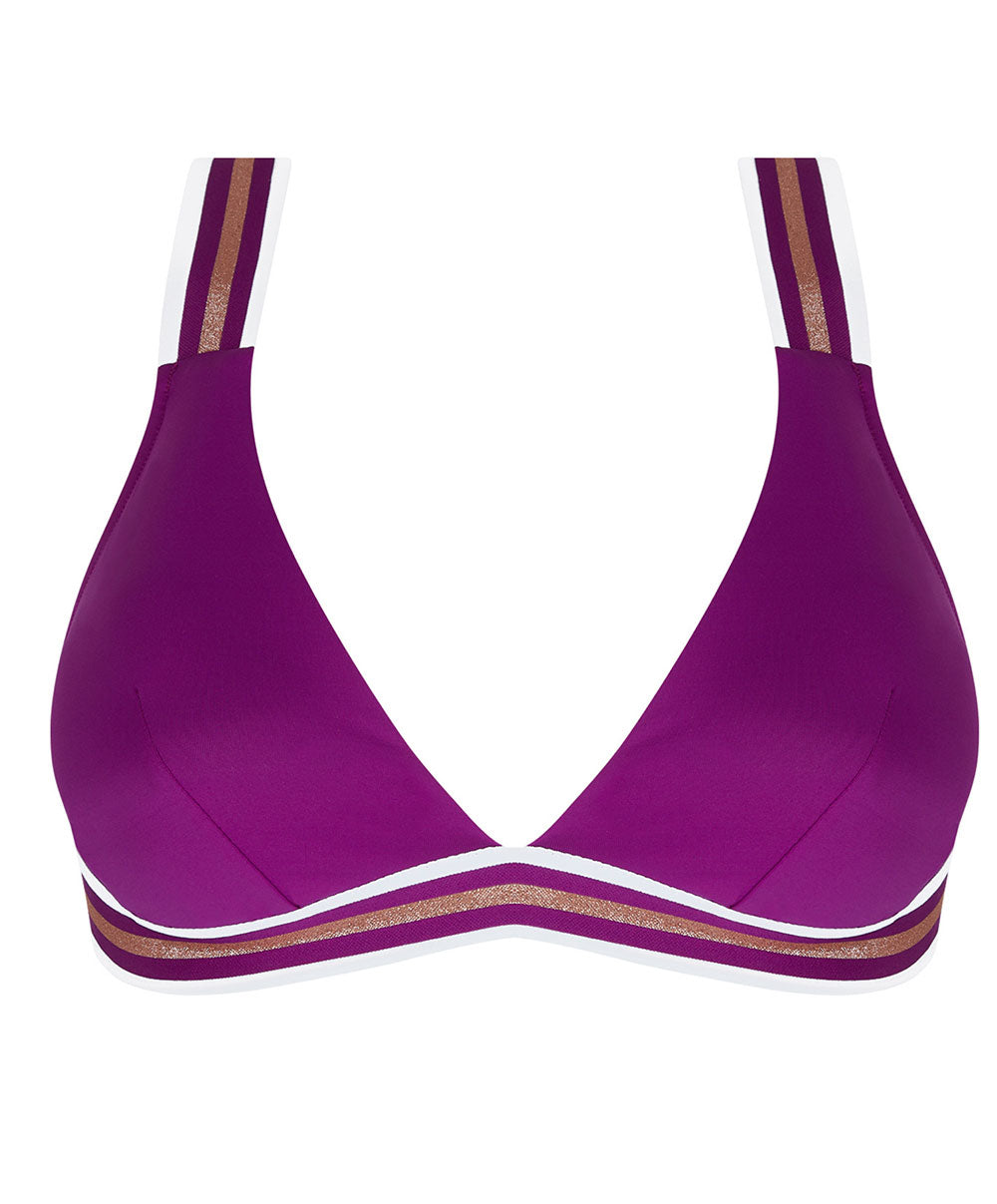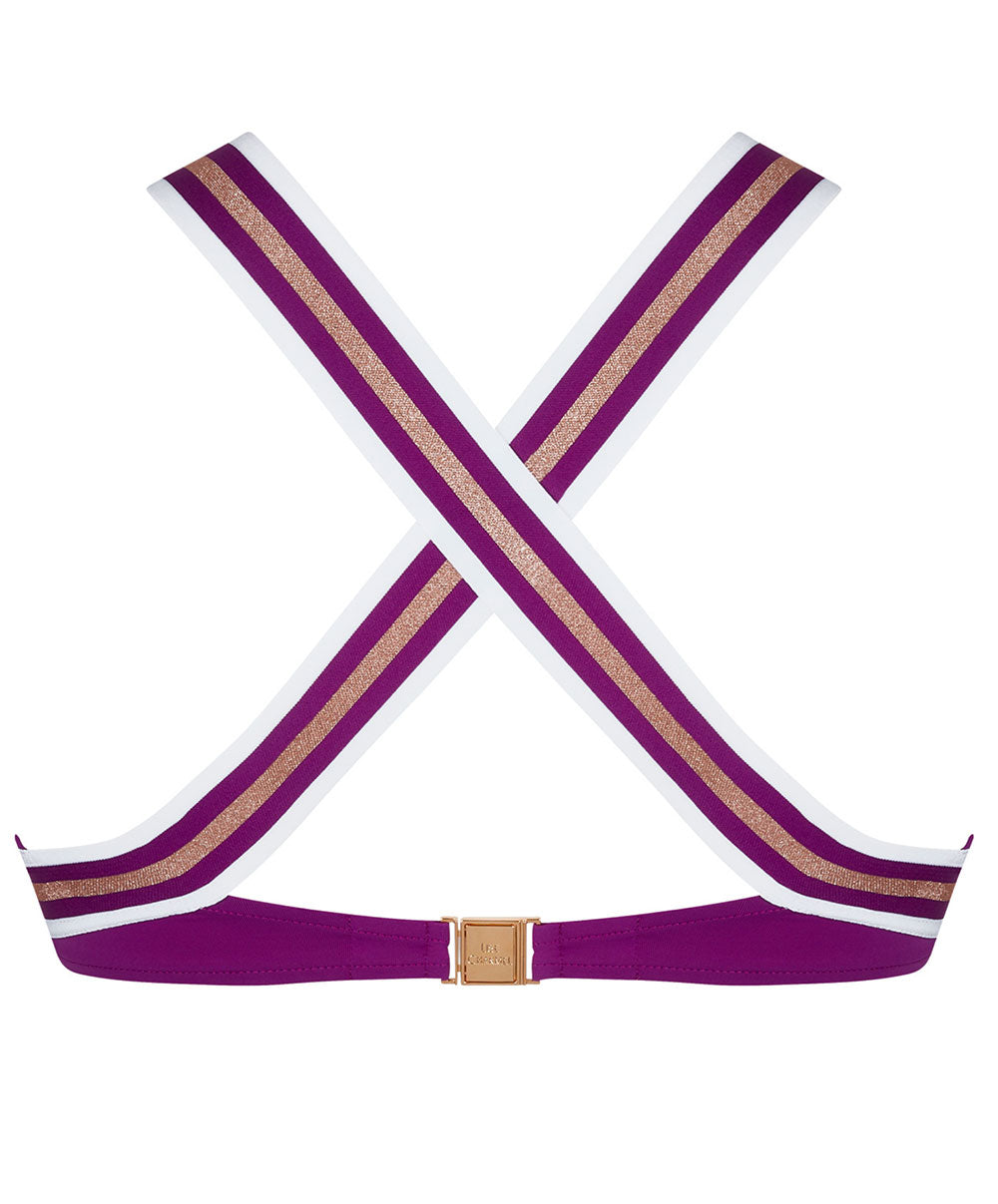 The Énergie Nautique swimwear collection from Lise Charmel: this line of swimwear offers swimsuits with a pure design simplicity in a haute couture spirit. These swimsuits are made from a very durable blackcurrant Lycra Sport® mesh that will hug your curves and last over time. The white and gold striped elasticated trims give them a sporty chic look and contrast with the solid color of the mesh for added originality.