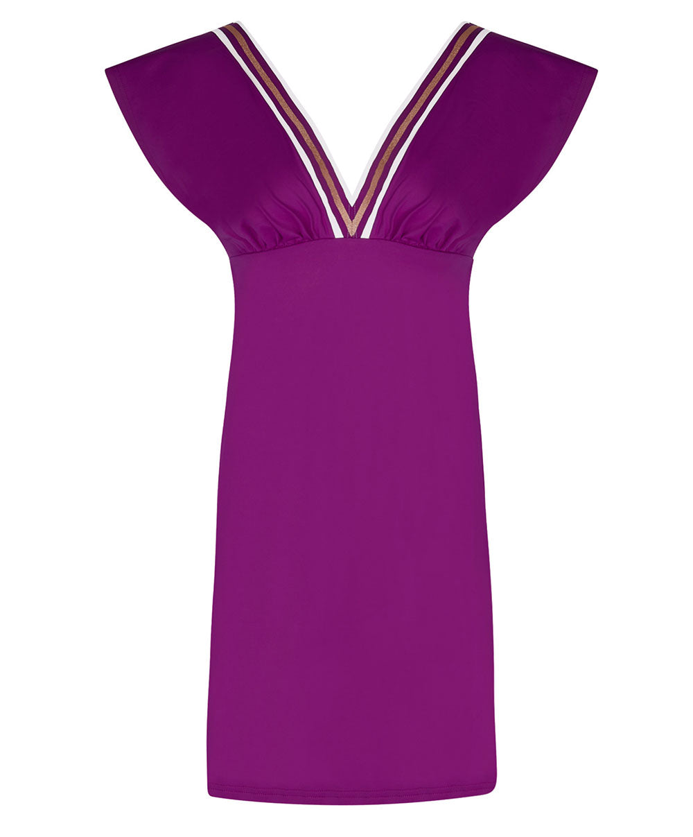 -Deeply refined solid blackcurrant knit, contrasted vividly by a stretchy striped border in blackcurrant, white and gold for a sporty chic look that is as original as you want.