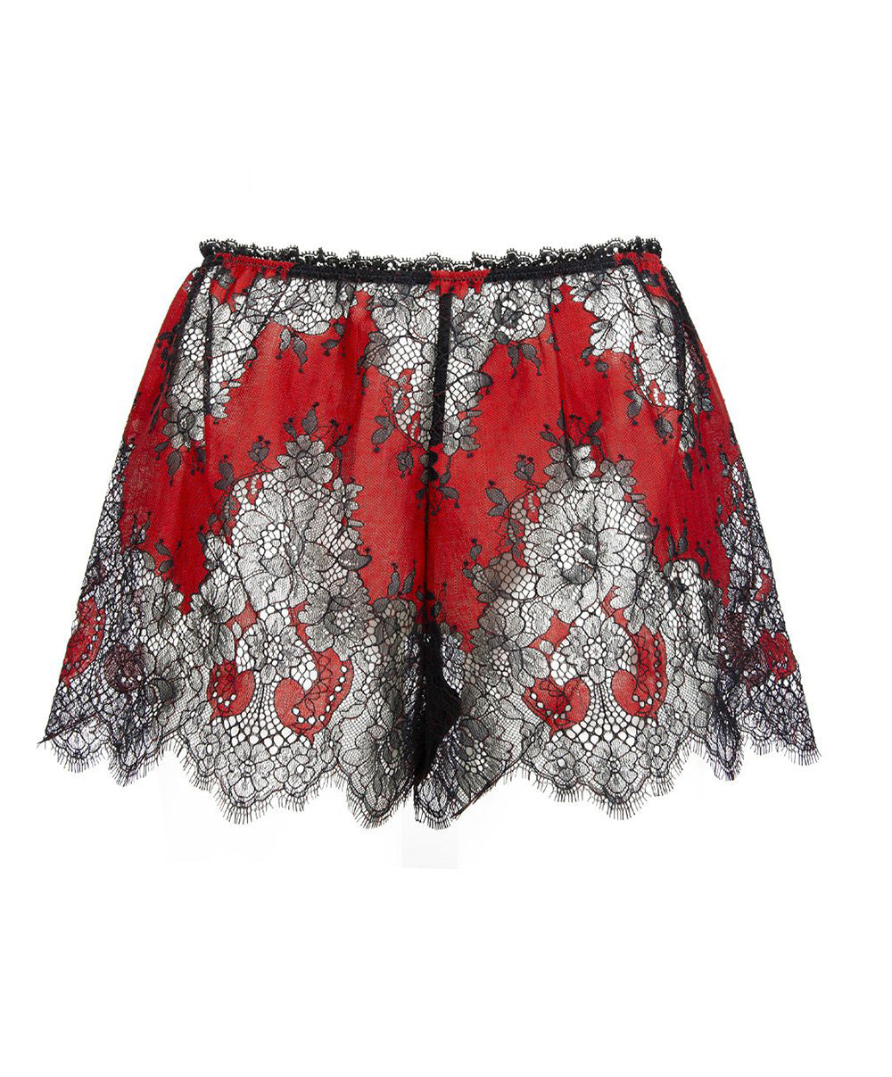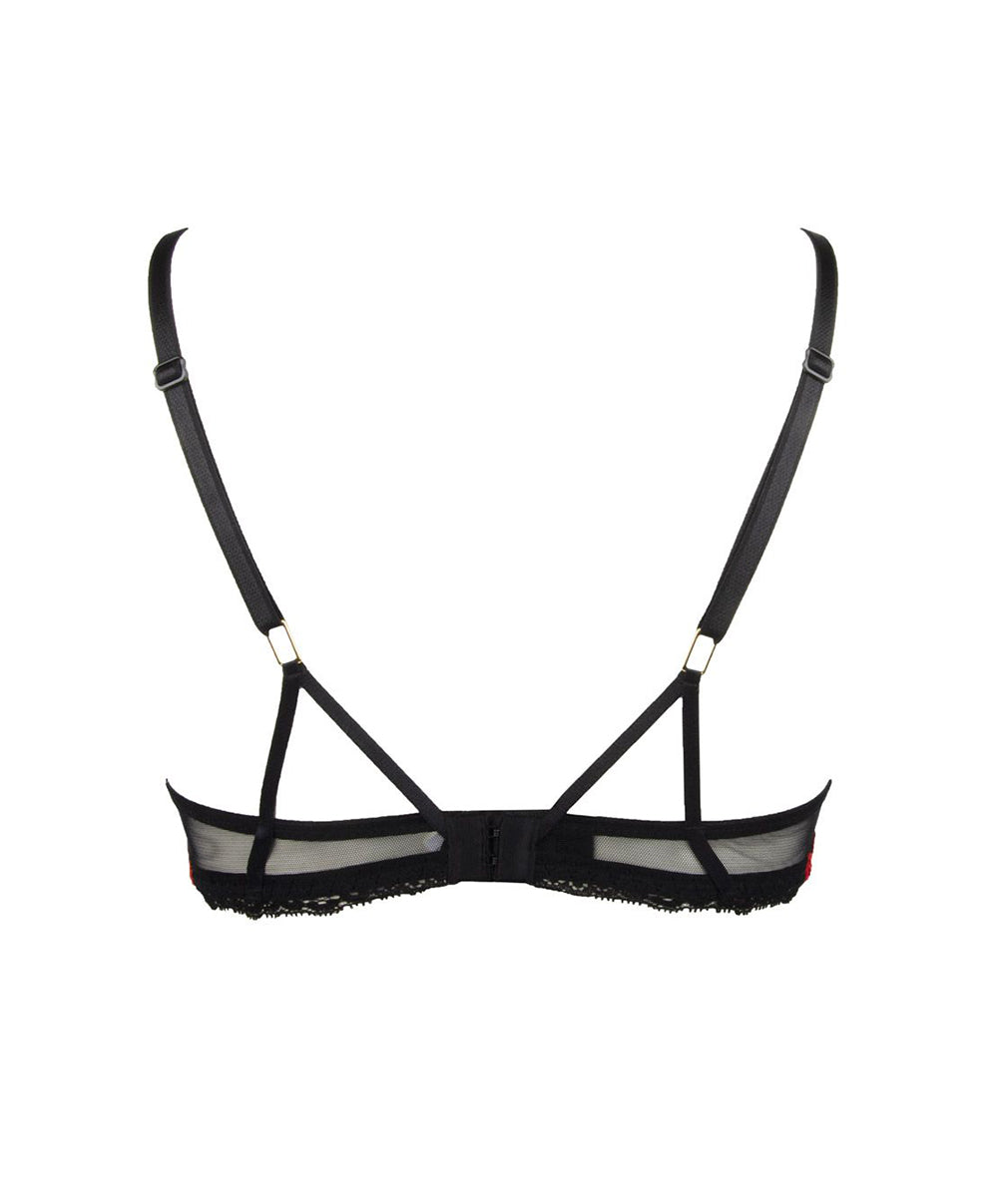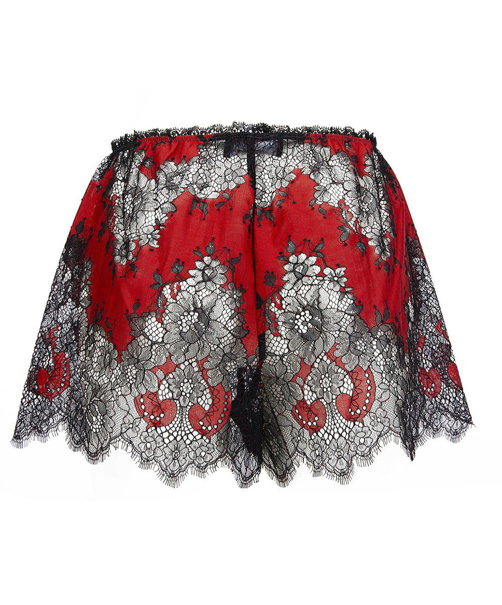 - Chic underwear made from opaque mesh (on the back) and openwork black tulle with red baroque embroidery studded with fuchsia details for an exalted look.