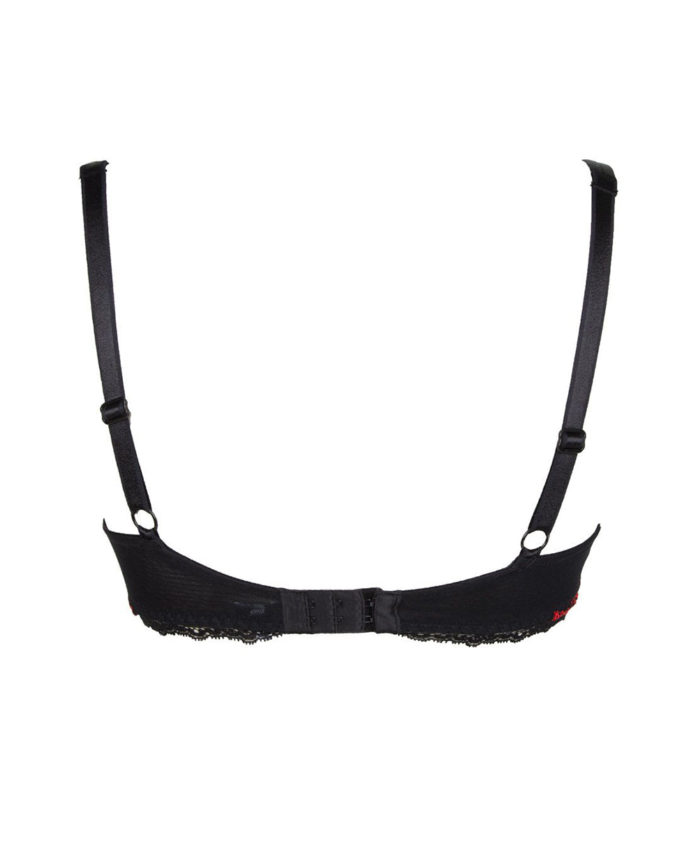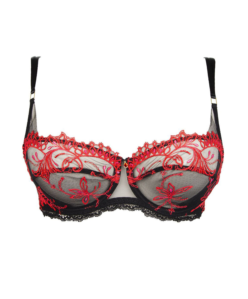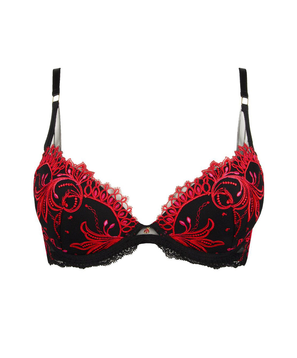 The Invitation Sexy lingerie collection by Lise Charmel: this sexy lingerie line offers a wide variety of chic underwear styles (both tops and bottoms) that will allow you to create a plethora of lingerie sets, each sexier than the last, and that will definitely leave your partner speechless! The chic underwear from Invitation Sexy has been made from fine black openwork tulle embroidered with majestic patterns inspired by the Baroque arts of the Renaissance that will give you a very romantic look... The red embroidery punctuated with flashy fuchsia details stands out sharply from the intense black base and thus contributes to the passionate look of this luxury French underwear...