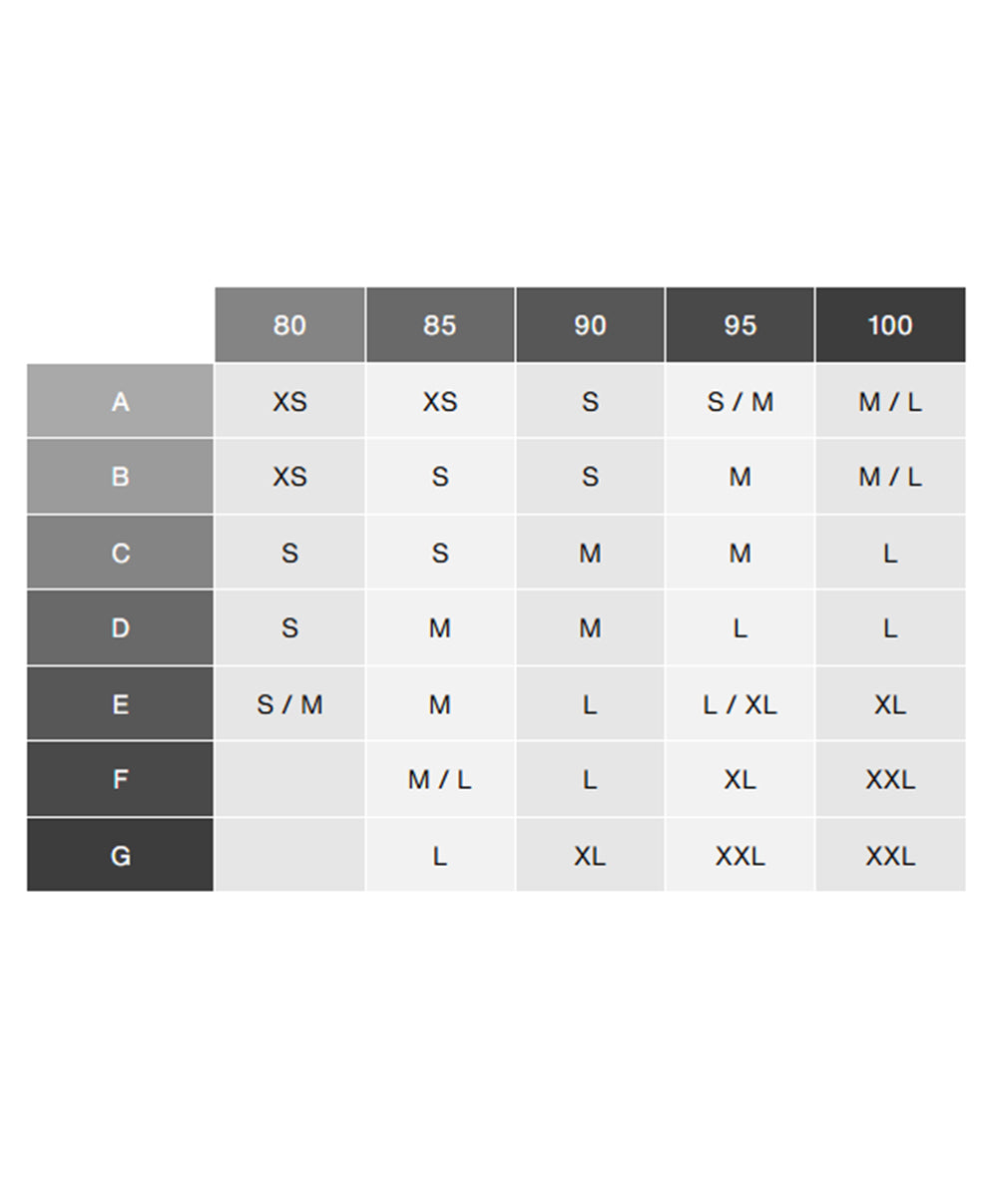 | FR SIZES | 80A - 80B | 85B -85C | 90B - 90C | 95B - 95C | 100C - 100D | 105C -105D |