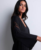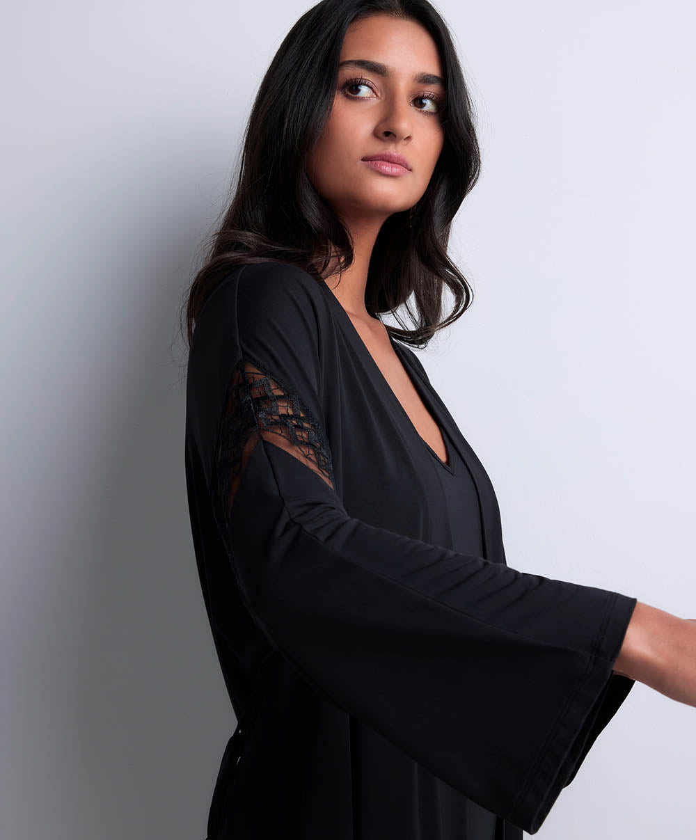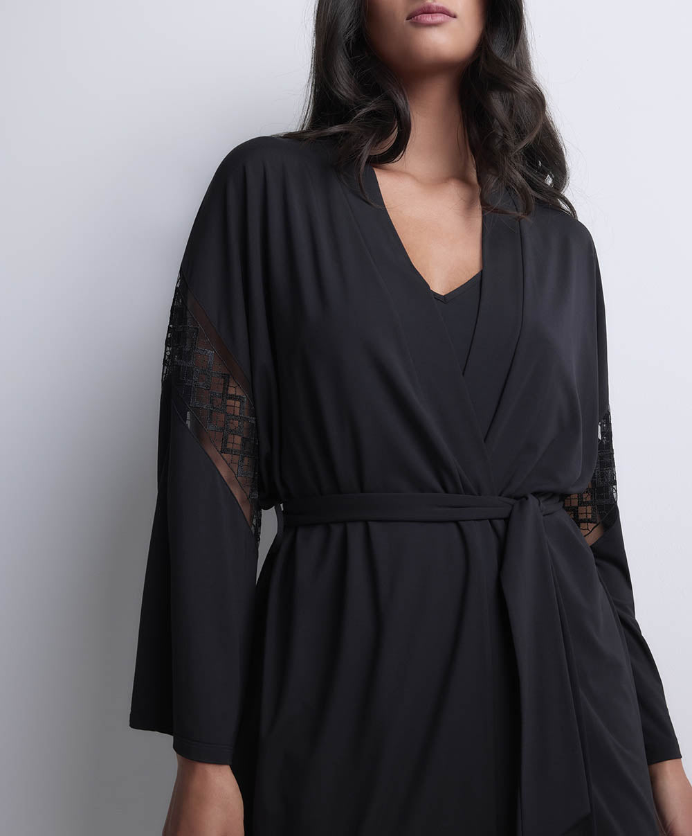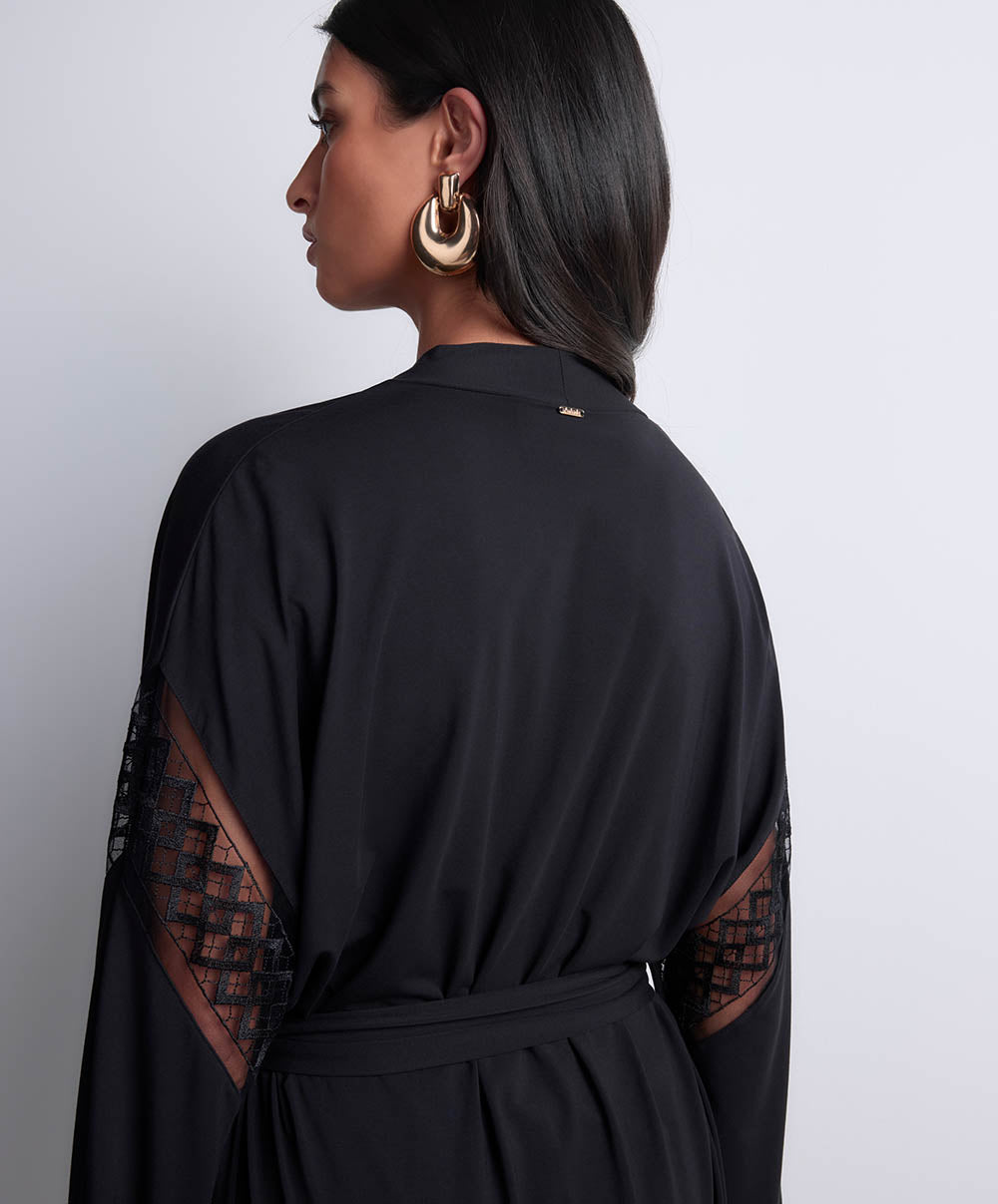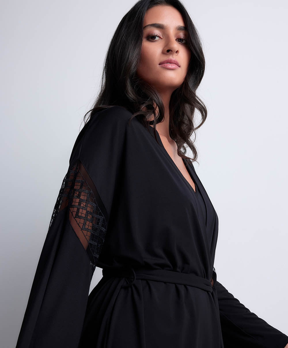 Le kimono Aubade, aux manches amples ornées d’un galon brodé, pour une allure sophistiquée