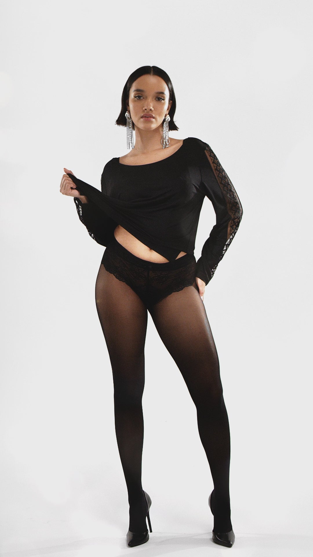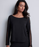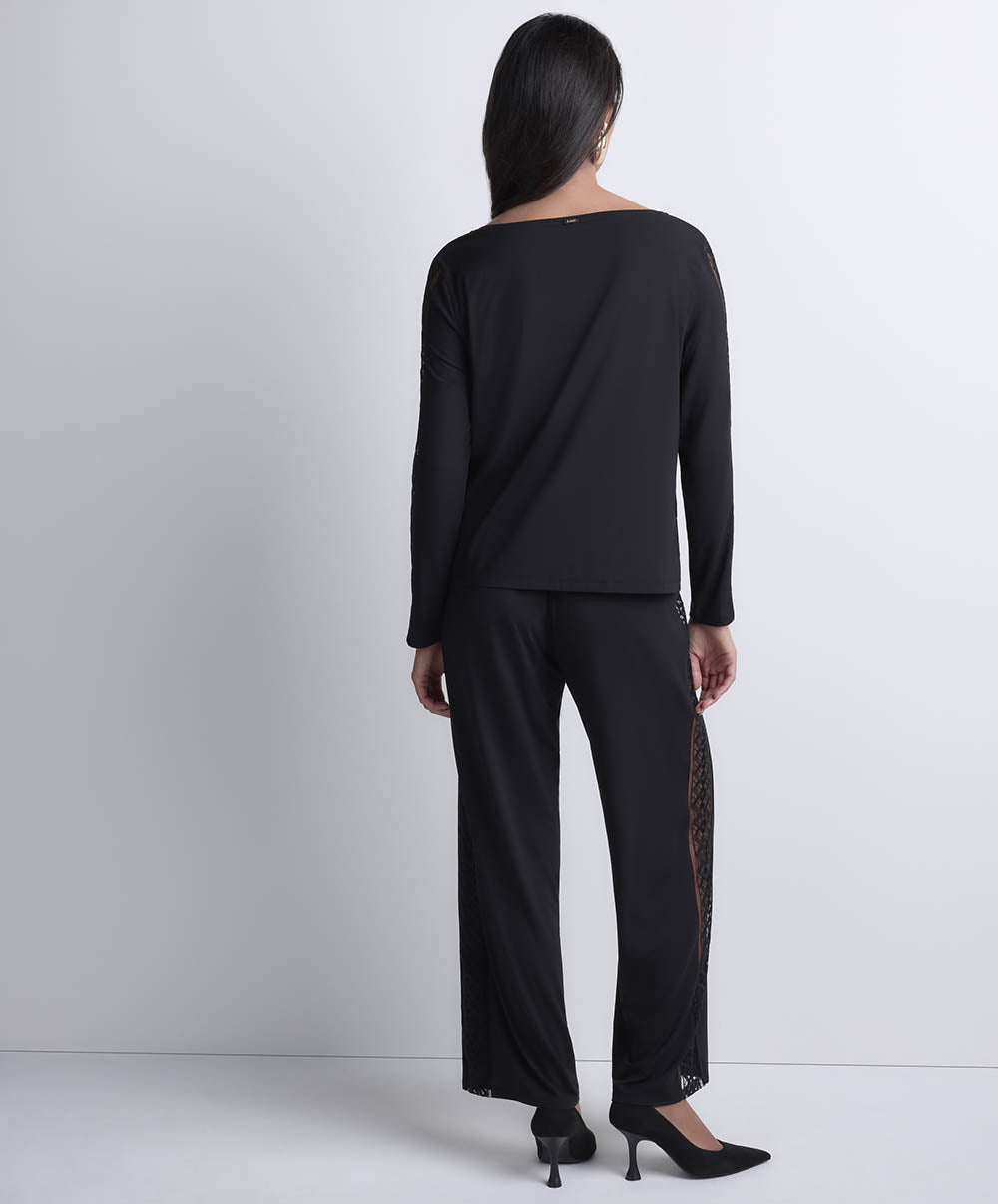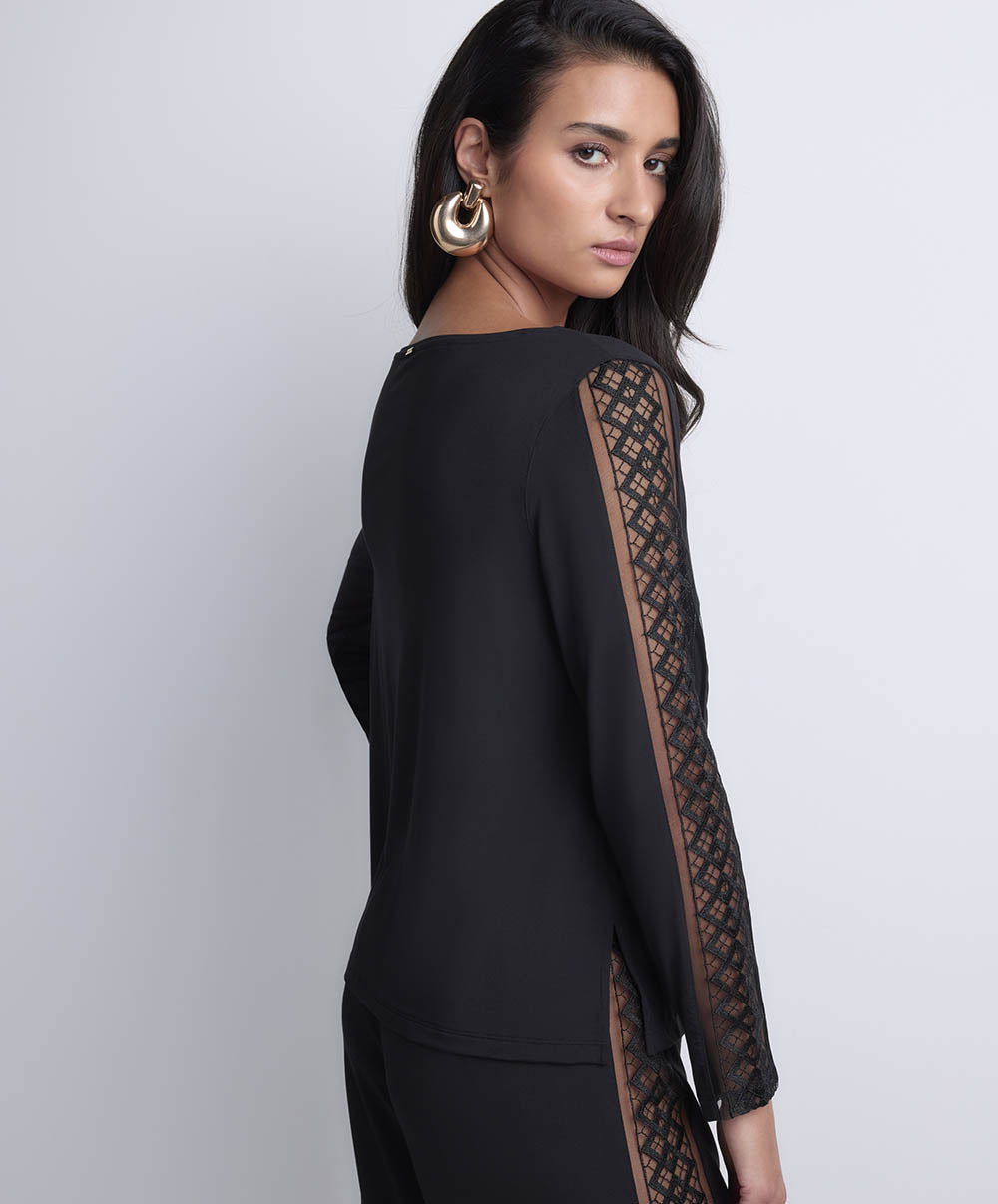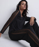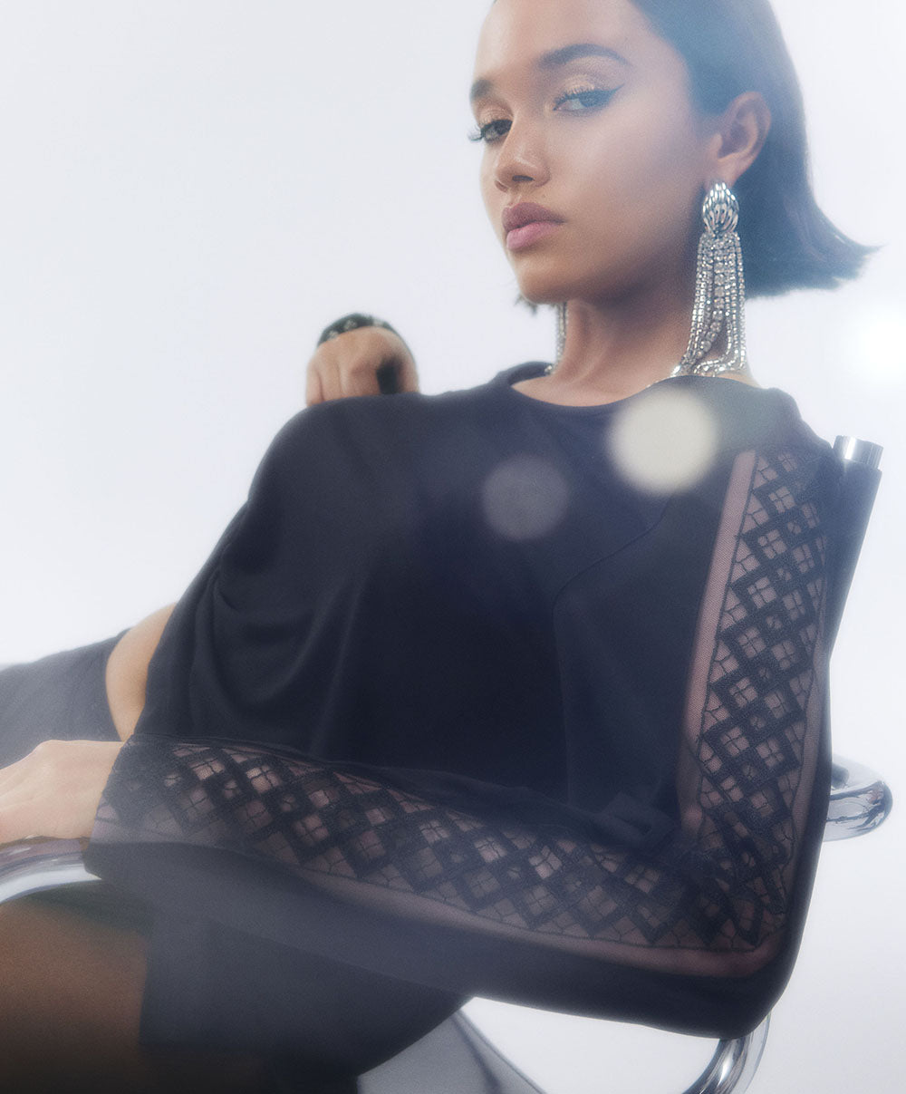 La maille en modal, douce et cosy, épouse le corps pour une sensation de bien-être à chaque instant. Les empiècements brodés graphiques révèlent subtilement les jambes et le décolleté, offrant une touche chic et audacieuse à chaque pièce.