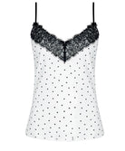 Ce caraco en maille de viscose imprimée séduit par sa matière douce, fluide et naturellement respirante, idéale pour un confort optimal au quotidien. Son imprimé à pois noirs en forme de cœur, signature de la collection, est délicatement souligné par des finitions en dentelle noire au décolleté, apportant une touche de féminité raffinée. Les fines bretelles réglables, ornées de petits nœuds décoratifs à l’entregorge et sur le devant, assurent un ajustement parfait et un charme subtil. Un top à fines bretelles à porter aussi bien en dessus-dessous, pour une silhouette élégante et confortable, de jour comme de nuit.
