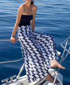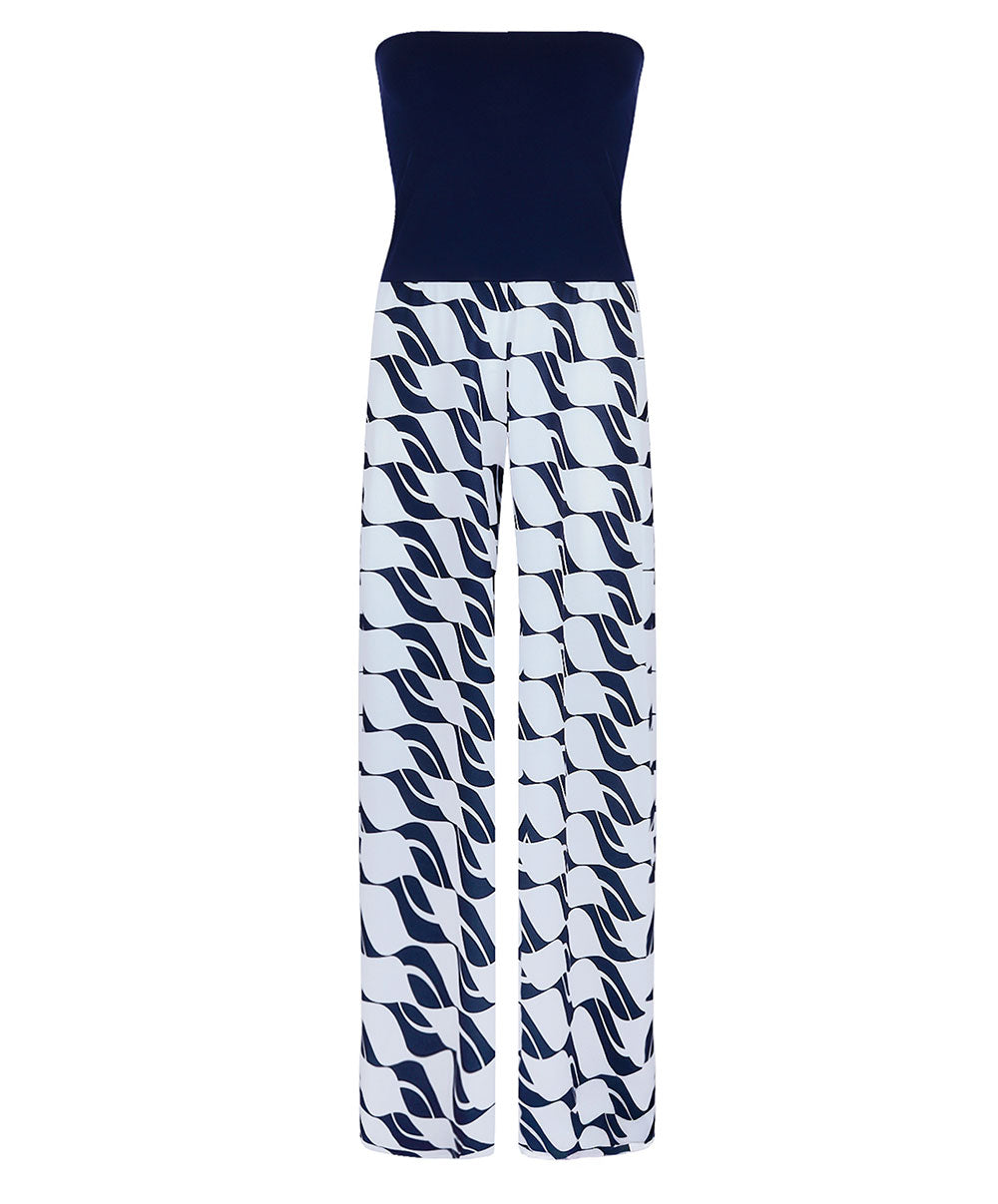 -Cette combinaison pantalon à motifs / top bustier uni offre une forme ample pour un porter fluide et aérien et présente une encolure horizontale très tendance ainsi qu'un élastique à la taille pour une silhouette cintrée. Côté style, cette pièce est également portable en guise de pantalon avec le buste retourné en revers à la taille.