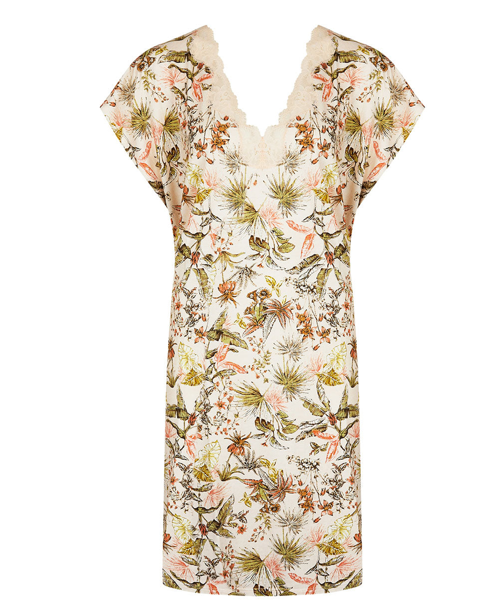 -Vêtement d'intérieur conçu en maille imprimée en viscose ultra douce pour un bien aller parfait et un confort sans égal, sublimée par une dentelle graphique perle pour une alllure élégante, romantique et féminine. L’imprimé emblématique Tigre de Jouy se transforme en un décor végétal délicat évoquant un matin paisible dans une nature luxuriante. Les motifs se déploient dans une palette subtile et raffinée où se mêlent verts mousse, rose saumoné et beige poudré.