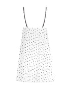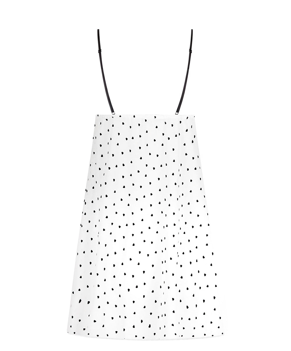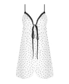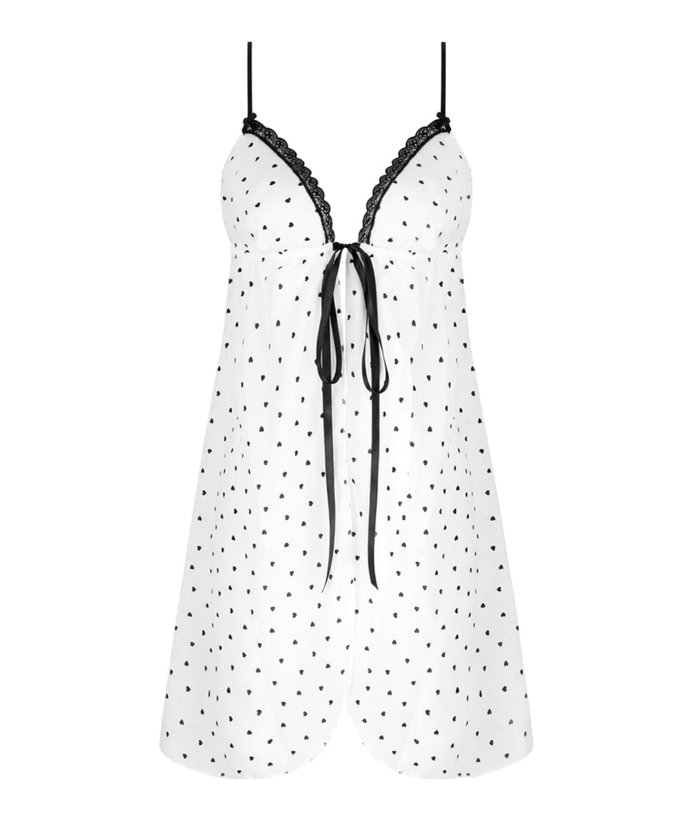 Cette nuisette sexy à fines bretelles, de longueur sous les fesses, sublime la silhouette avec légèreté et féminité. Confectionnée en voile de viscose imprimé, elle offre une matière douce, fluide et naturellement respirante, idéale pour un confort seconde peau. Son imprimé à pois noirs en forme de cœur, signature de la collection, est délicatement souligné par des finitions en dentelle noire au décolleté, pour une allure à la fois chic et audacieuse. Les fines bretelles réglables assurent un ajustement parfait, tandis que le nœud et le ruban à l’entregorge, permettant la fermeture sur le devant, apportent une touche séduisante et raffinée à ce babydoll de nuit.