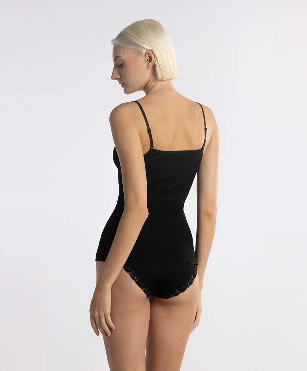Débardeur laine et soie avec dentelle Leavers bretelles fines noir collection Basic femme Wool & Silk de chez Oscalito.