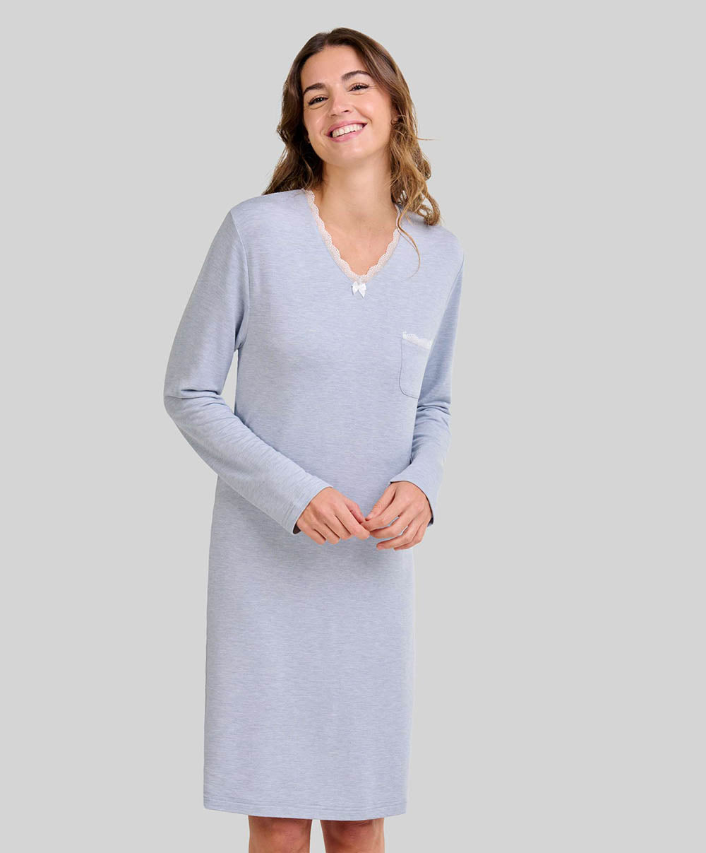 Cette chemise de nuit de LOHE est une pièce chaleureuse et délicate conçue pour vous accompagner pendant les nuits froides. Réalisée dans un tissu gaufré agréable au toucher, elle allie confort et élégance avec son col en V agrémenté d’un subtil détail en dentelle. Cette robe à manches longues, dans un bleu acier profond, offre un équilibre parfait entre féminité et praticité.