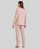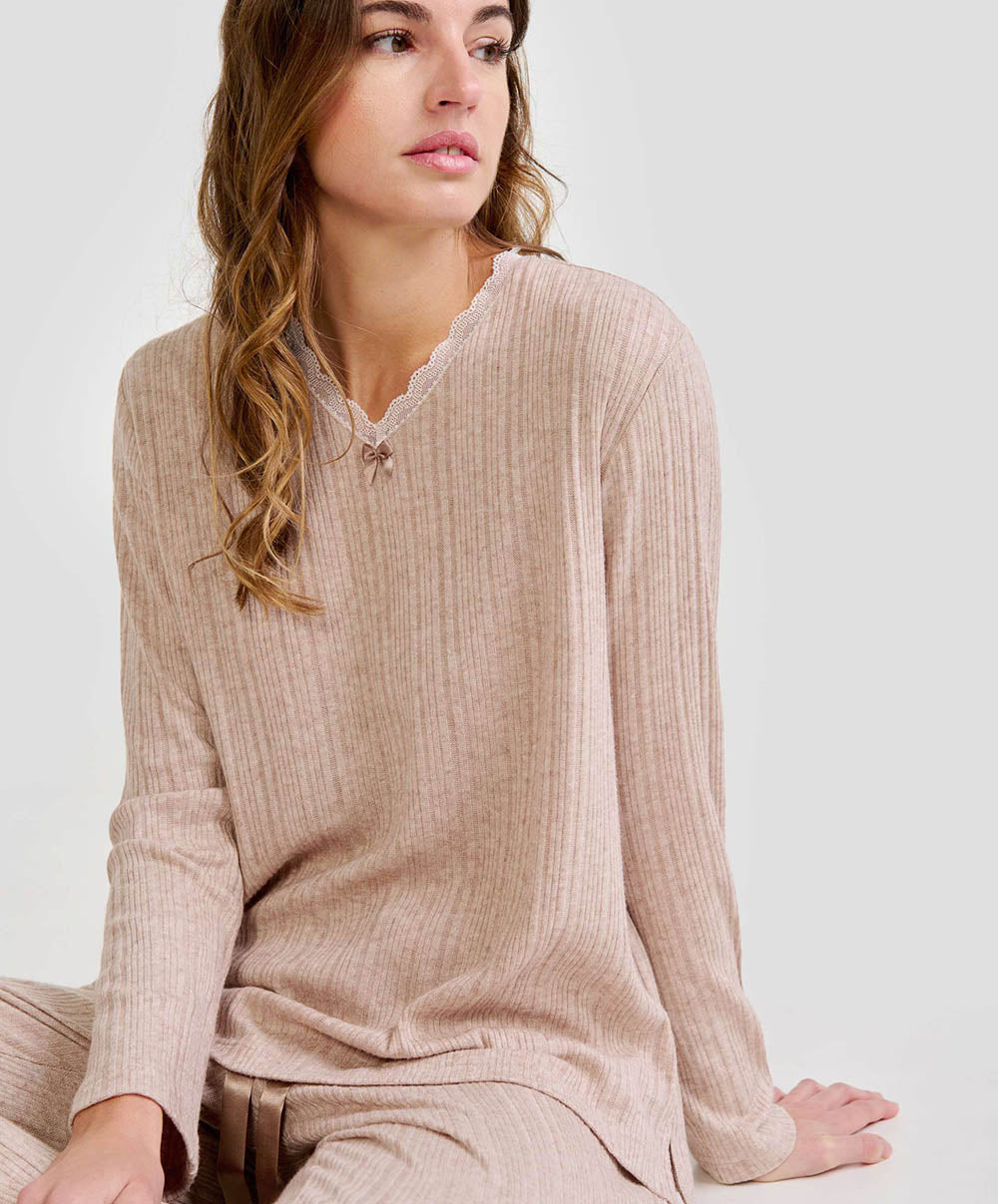 Ce pyjama féminin LOHE se distingue par son tissu côtelé doux et confortable, parfait pour les nuits fraîches d’automne et d’hiver. Sa couleur camel chaleureuse s’accompagne d’un col en V orné d’un fin détail de dentelle, apportant une touche subtile de raffinement. Avec ses manches longues et son pantalon long agrémenté d’un nœud en satin à la taille, ce modèle allie élégance et confort au quotidien.
