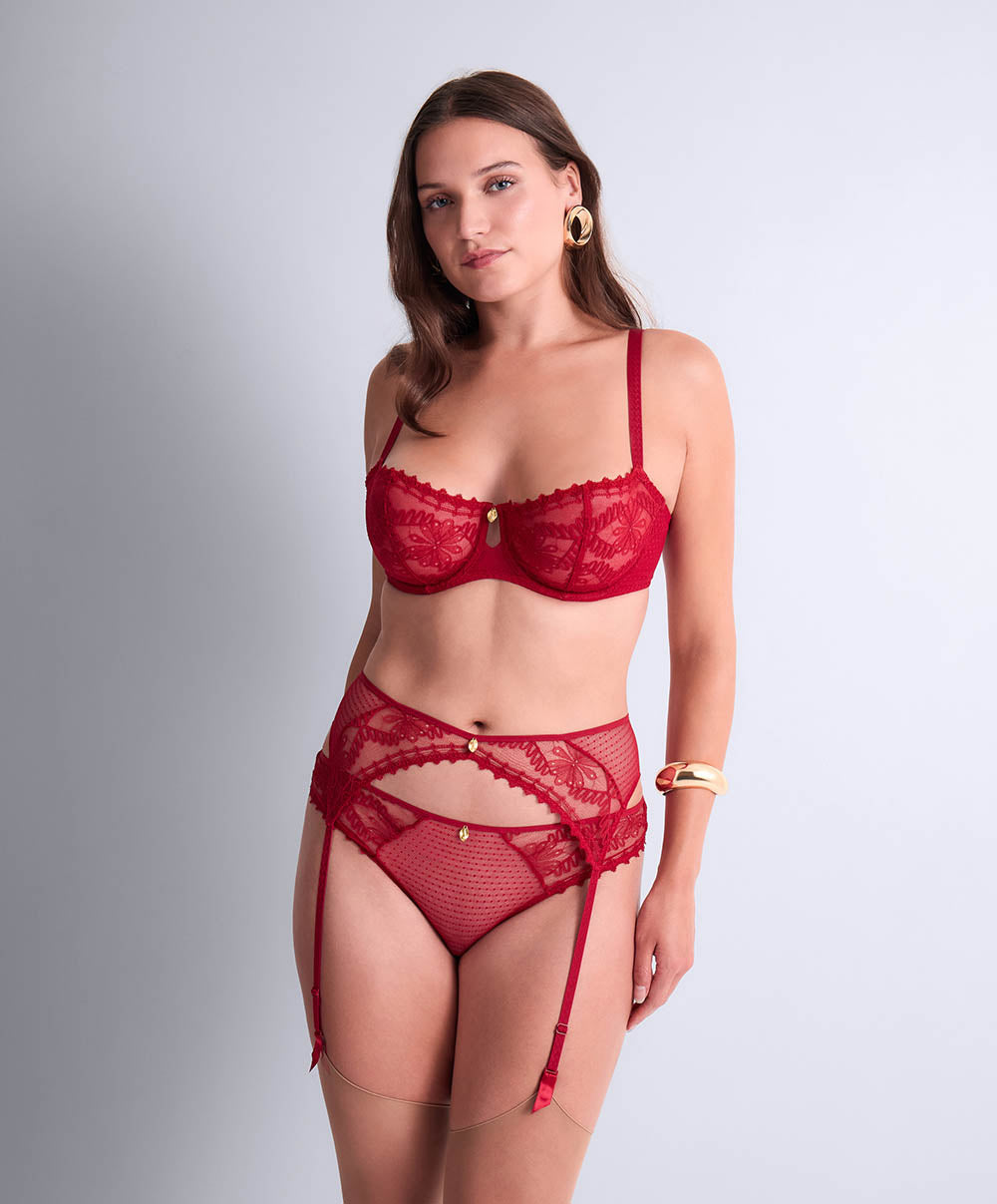 Sa dentelle Leavers, à la fois fine et graphique, se marie à un plumetis aérien pour épouser vos courbes avec sensualité et légèreté. Ce jeu subtil de matière révèle une silhouette tout en douceur, tandis que de précieux détails viennent parfaire chaque pièce : un bijou feuillage au fini martelé, des gouttes dorées et des anneaux délicats, autant de touches raffinées qui illuminent les parures.