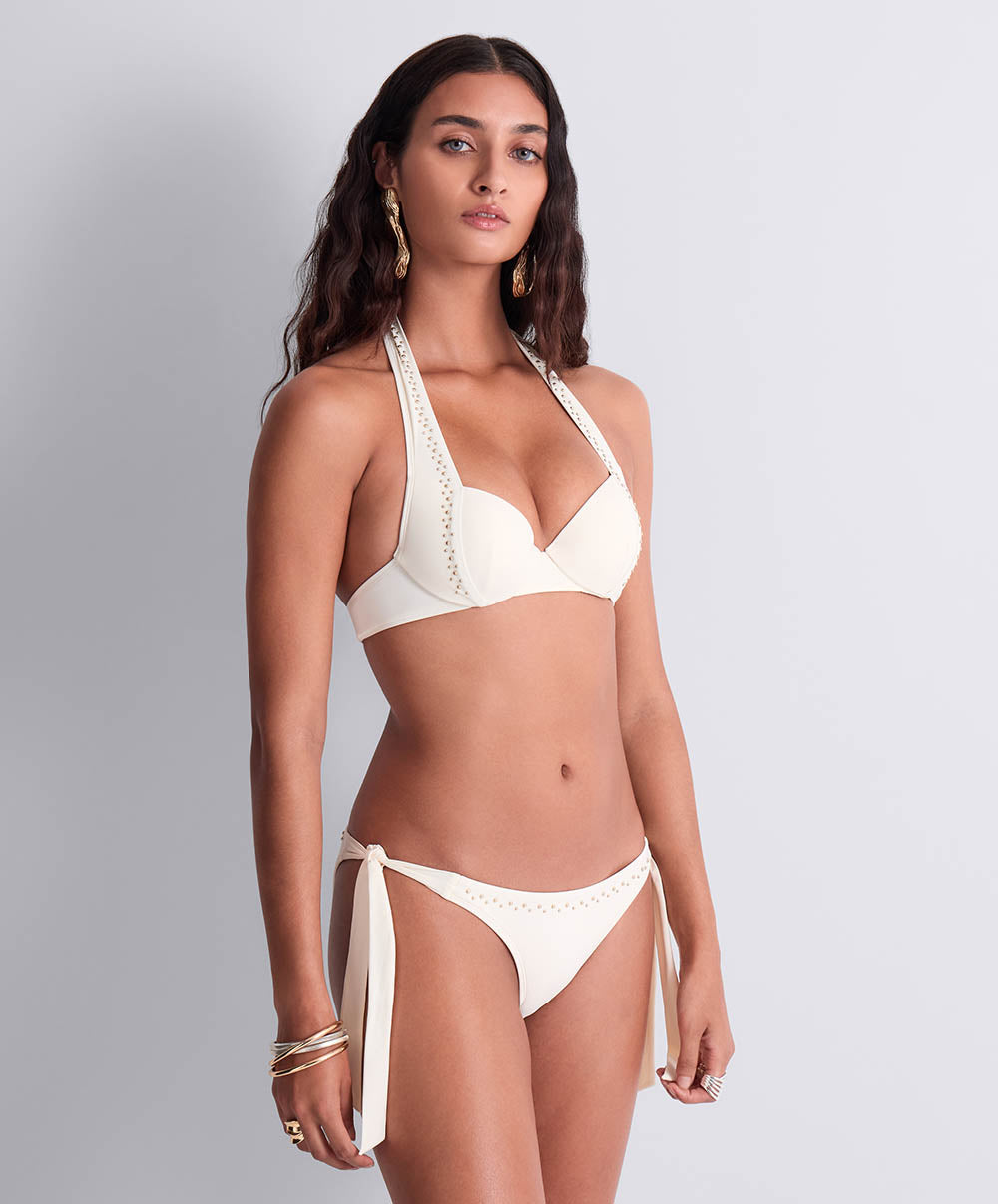 La ligne est conçue dans une maille recyclée au fini mat. L'accent est mis sur le décolleté et la taille par des motifs de clous dorés qui captent la lumière du soleil.
