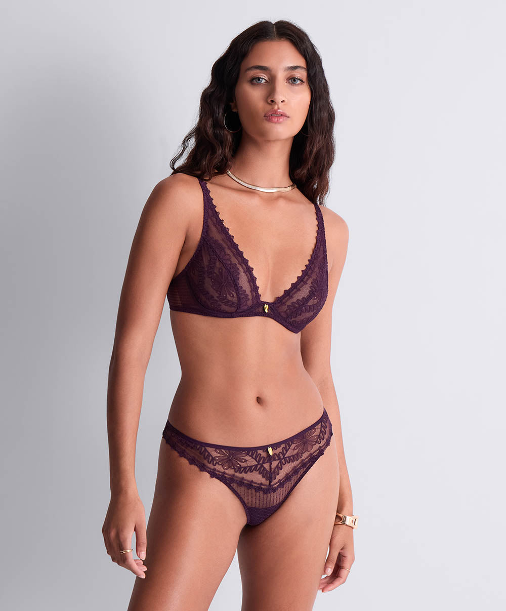 Sa dentelle Leavers, à la fois fine et graphique, se marie à un plumetis aérien pour épouser vos courbes avec sensualité et légèreté. Ce jeu subtil de matière révèle une silhouette tout en douceur, tandis que de précieux détails viennent parfaire chaque pièce : un bijou feuillage au fini martelé, des gouttes dorées et des anneaux délicats, autant de touches raffinées qui illuminent les parures.